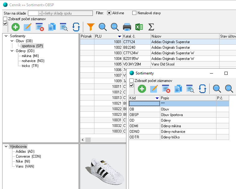 Príklad využitia stromu sortimentov a výrobcov pri zobrazení cenníka v "športovej" predajni.