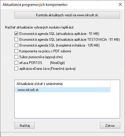Aktualizáciu spustíte z menu hlavného okna programu alebo z okna Zoznam firiem: Systémové služby - Aktualizácia. Zobrazí sa dialógové okno pre výber parametrov aktualizácie. Stlačením tlačidla Načítaj sa spustí sťahovanie označených súborov z vybratého umiestnenia a po ich stiahnutí samotná aktualizácia.
